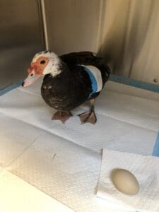 This sweet pet duck was attacked by a goose and presented to us the following afternoon in pain and with a drooping wing. She was assessed, then sedated for radiographs which confirmed a fractured humerus. We wrapped the wing and administered analgesics to help make her comfortable and prevent further damage, then settled her into a comfy incubator for the night, with surgery scheduled for the next morning.