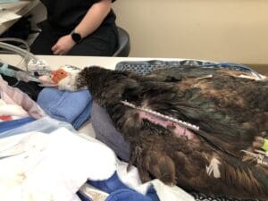 Surgery went off without a hitch, and everything looked great afterwards. The surgical site was thoroughly cleaned, the fixator cushioned with padded gauze and the wing wrapped with bandaging material to keep everything clean, dry, and protected.